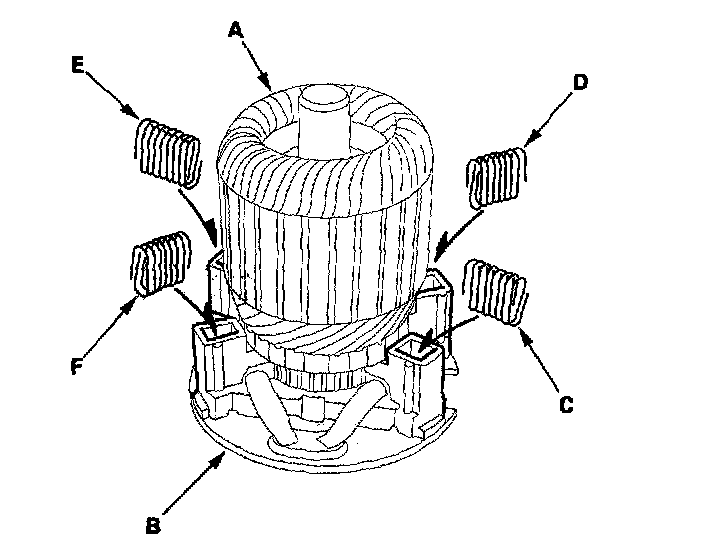 18. While,squeezing a spring (C), insert it in the hole on the brush holder, and push it until it bottoms. Repeat this for the other three springs (D, E, and F).