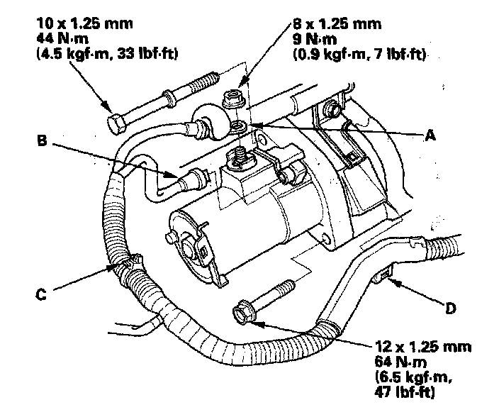 4. Disconnect the starter cable (A) from the B terminal, then disconnect the BLK/WHT wire (B) from the S terminal.