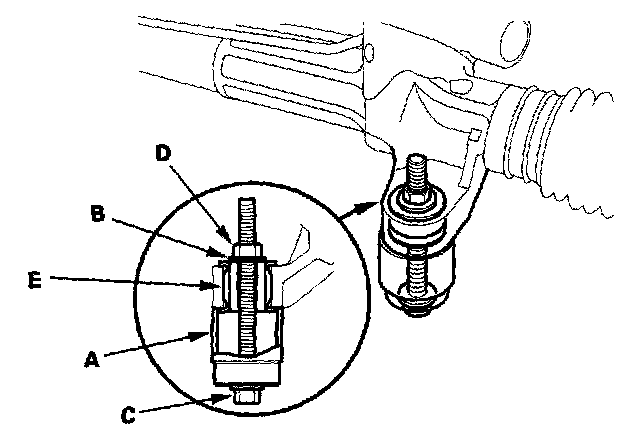 3. Hold the flange bolt with a wrench, and tighten the nut with a wrench. Remove the gearbox mount cushion (E).