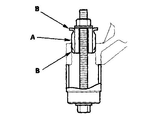 6. Install the gearbox mount cushion by tightening the nut until the mount cushion edges (B) properly fit on the gearbox flange surface.