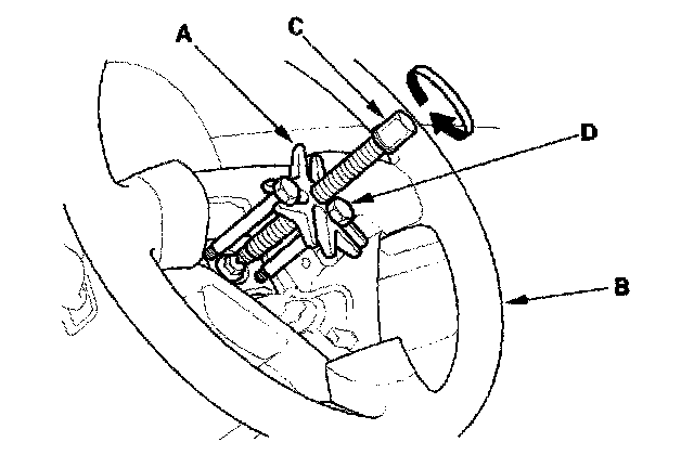 5. Install a commercially available steering wheel puller (A) on the steering wheel (B). Free the steering wheel from the steering column shaft by turning the pressure bolt (C) of the puller.