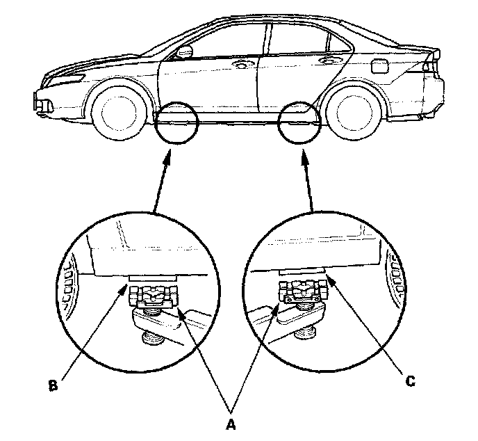 3. Position the floor jack under the front jacking bracket (A) or rear jacking bracket (B), center the jacking bracket in the jack lift platform (C), and jack up the vehicle high enough to fit the safety stands under it.