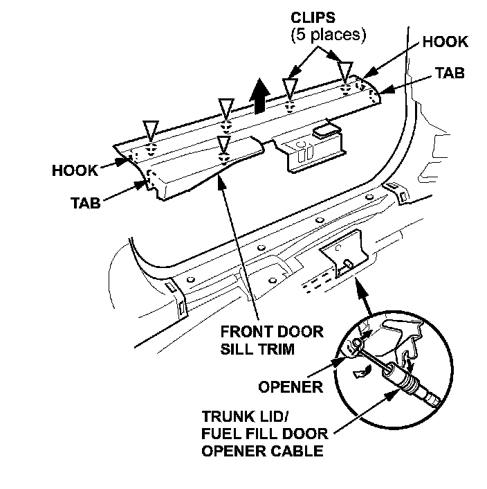 4. Pull up the front door sill trim by hand to release the five clips, then remove the front door sill trim. Note which of the three grooves on the opener cable the opener assembly is attached to. Disconnect the cable from the trunk lid/fuel fill door opener assembly.