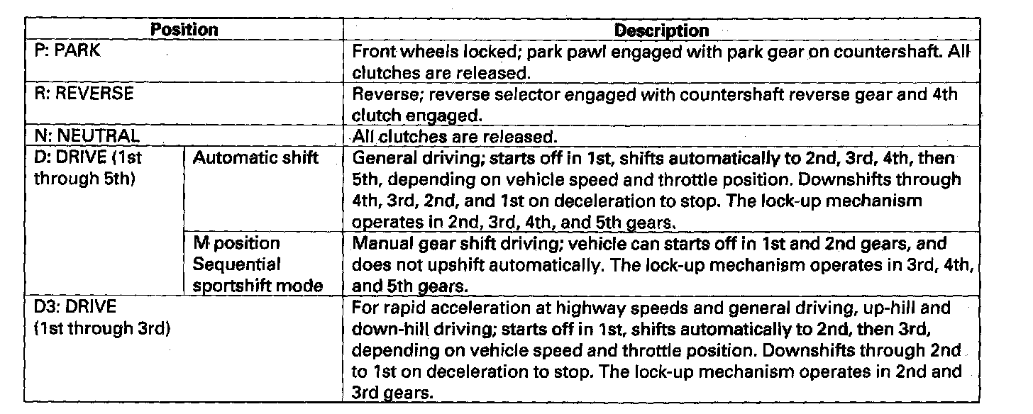 The shift lever has five positions: P: PARK, R: REVERSE, N: NEUTRAL, D: DRIVE 1st through 5th gear range with automatic shift and sequential sportshift in M (sequential sportshift mode) position, and D3: DRIVE 1st through 3rd gear range with automatic shift.