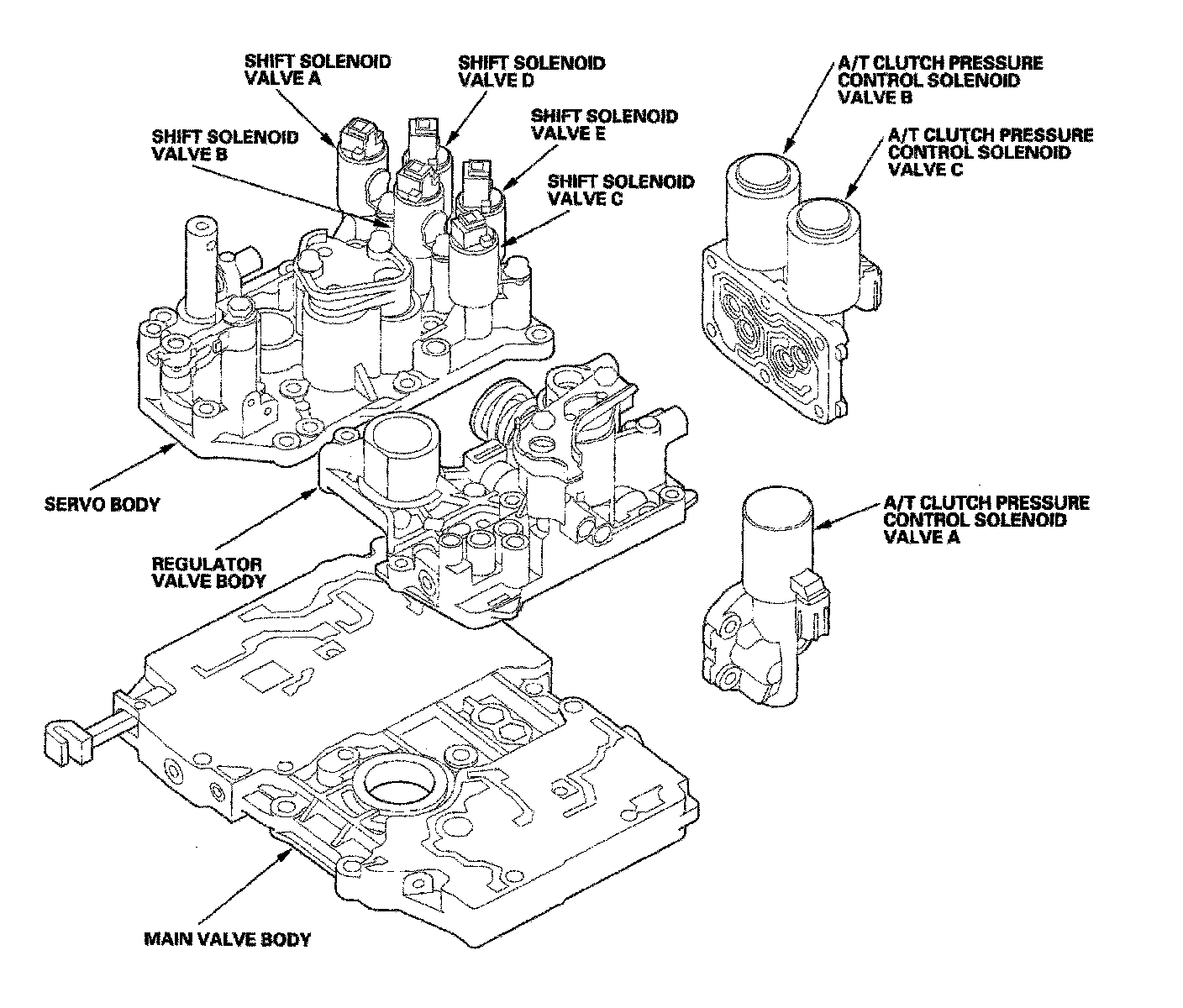 The valve body includes the main valve body, the regulator valve body, and the servo body. The ATF pump is driven by splines on the left end of the torque converter which is attached to the engine. Fluid flows through the regulator valve to maintain specified pressure through the main valve body to the manual valve, directing pressure to the shift valves and to each of the clutches via the solenoid valves. The shift solenoid valves A, B, C, D, and E are bolted on the servo body. The A/T clutch pressure control solenoid valves A, B, and C are mounted on the outside of the transmission housing.