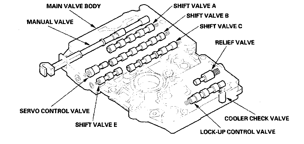The main valve body contains the manual valve, the shift valves A, B, C, and E, the relief valve, the lock-up control valve, the cooler check valve, the servo control valve, and the ATF pump gears. The primary function of the main valve body is to switch fluid pressure on and off and to control hydraulic pressure going to the hydraulic control system.
