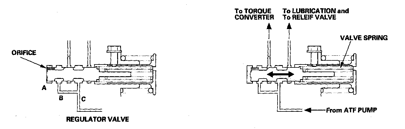 The regulator valve maintains a constant hydraulic pressure from the ATF pump to the hydraulic control system, while also furnishing fluid to the lubrication system and torque converter. The fluid from the ATF pump flows through B and C. Fluid entering from B flows through the valve orifice to the A cavity. This pressure of the A cavity pushes the regulator valve to valve spring side, and this movement of the regulator valve uncovers the fluid port to the torque converter and the relief valve. The fluid flows out to the torque converter and the relief valve, and the regulator valve returns under spring force. According to the level of the hydraulic pressure through B. the position of the regulator valve changes, and the amount of fluid from C through torque converter also changes. This operation is continued, maintaining the line pressure.