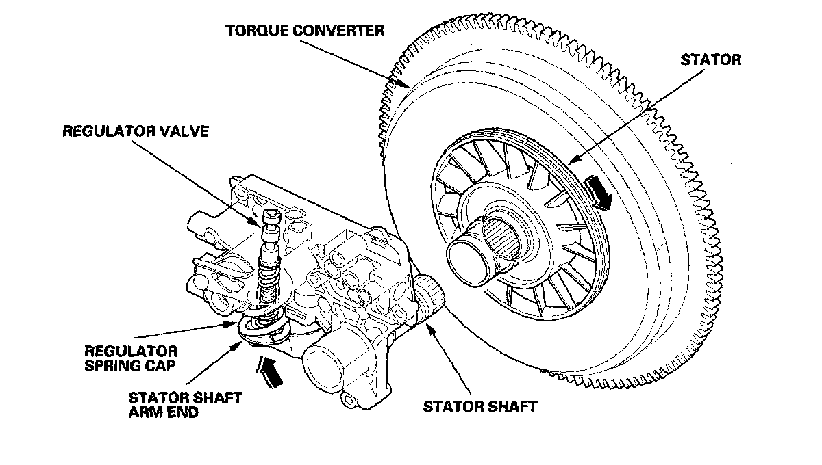 Increases in hydraulic pressure according to torque are performed by the regulator valve using stator torque reaction. The stator shaft is splined with the stator in the torque converter, and its arm end contacts the regulator spring cap. When the vehicle is accelerating or climbing (torque converter range), stator torque reaction acts on the stator shaft, and the stator arm pushes the regulator spring cap in the direction of the arrow in proportion to the reaction. The stator reaction spring compresses, and the regulator valve moves to increase the line pressure which is regulated by the regulator valve. The line pressure reaches its maximum when the stator torque reaction reaches its maximum.