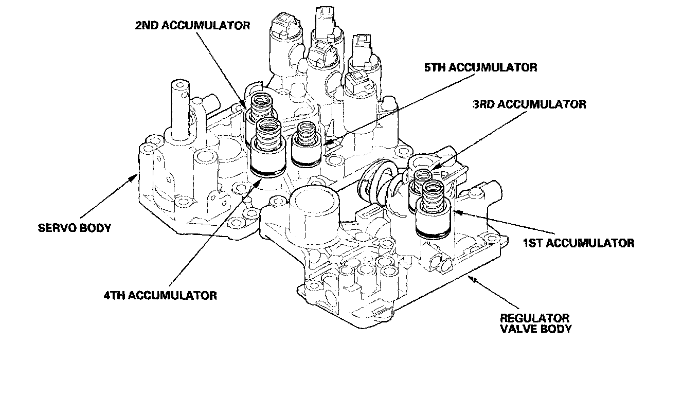 The accumulators are located in the regulator valve body and the servo body. The regulator valve body contains the 1st and 3rd accumulators, and the servo body contains the 2nd, 4th, and 5th accumulators.