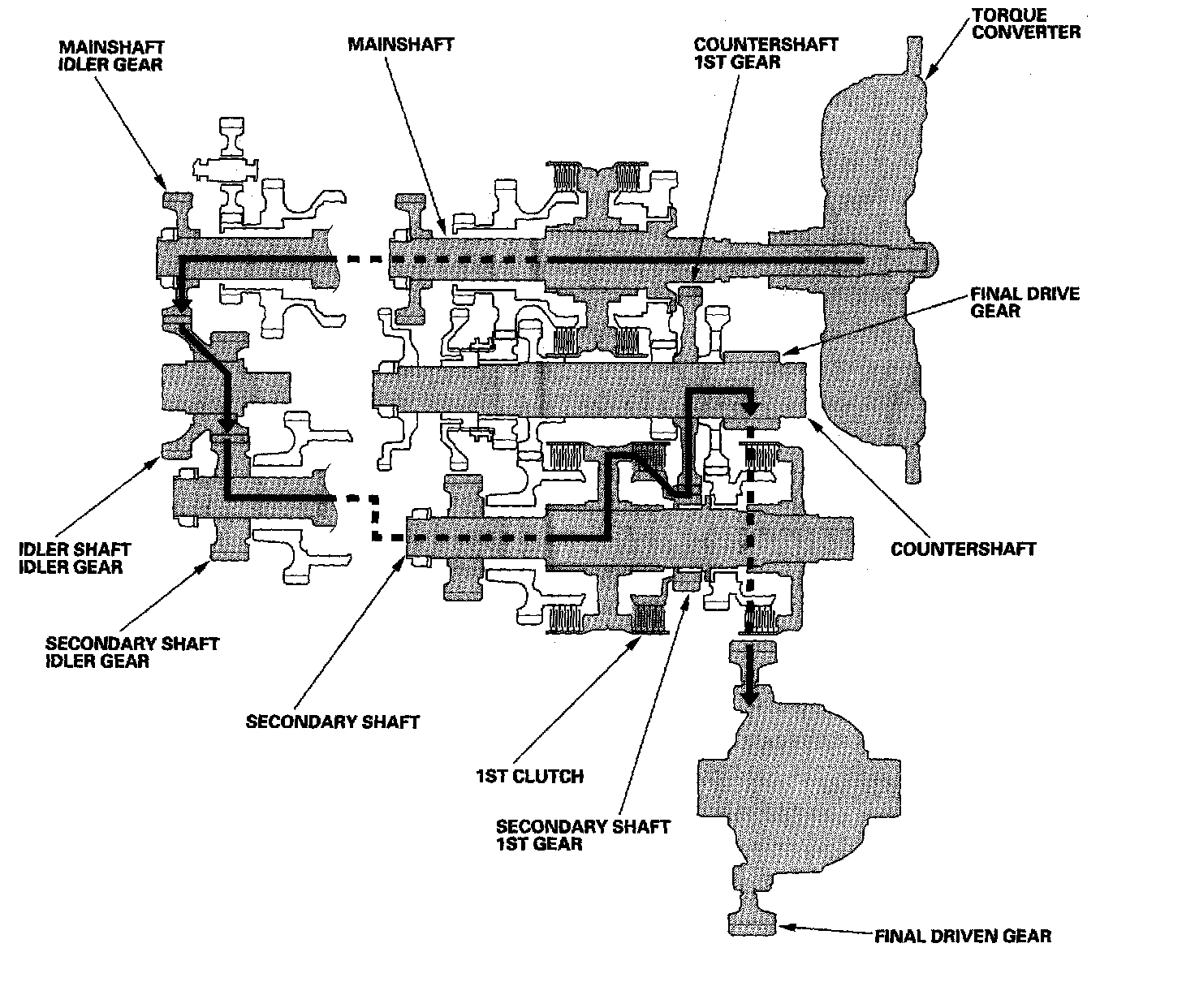 - Hydraulic pressure is applied to the 1st clutch, then the 1st clutch engages the secondary shaft 1st gear with the secondary shaft.