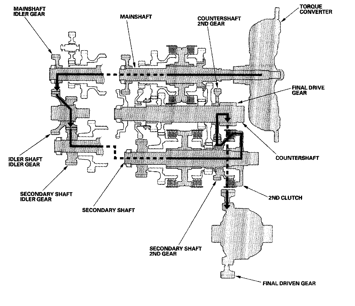 - Hydraulic pressure is applied to the 2nd clutch, then the 2nd clutch engages the secondary shaft 2nd gear with the secondary shaft.