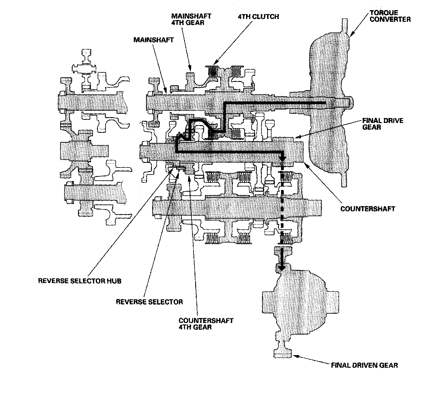 - When shifted from D position, the reverse selector engages with the countershaft 4th gear and the reverse selector hub, and the 4th gear engages with the countershaft.