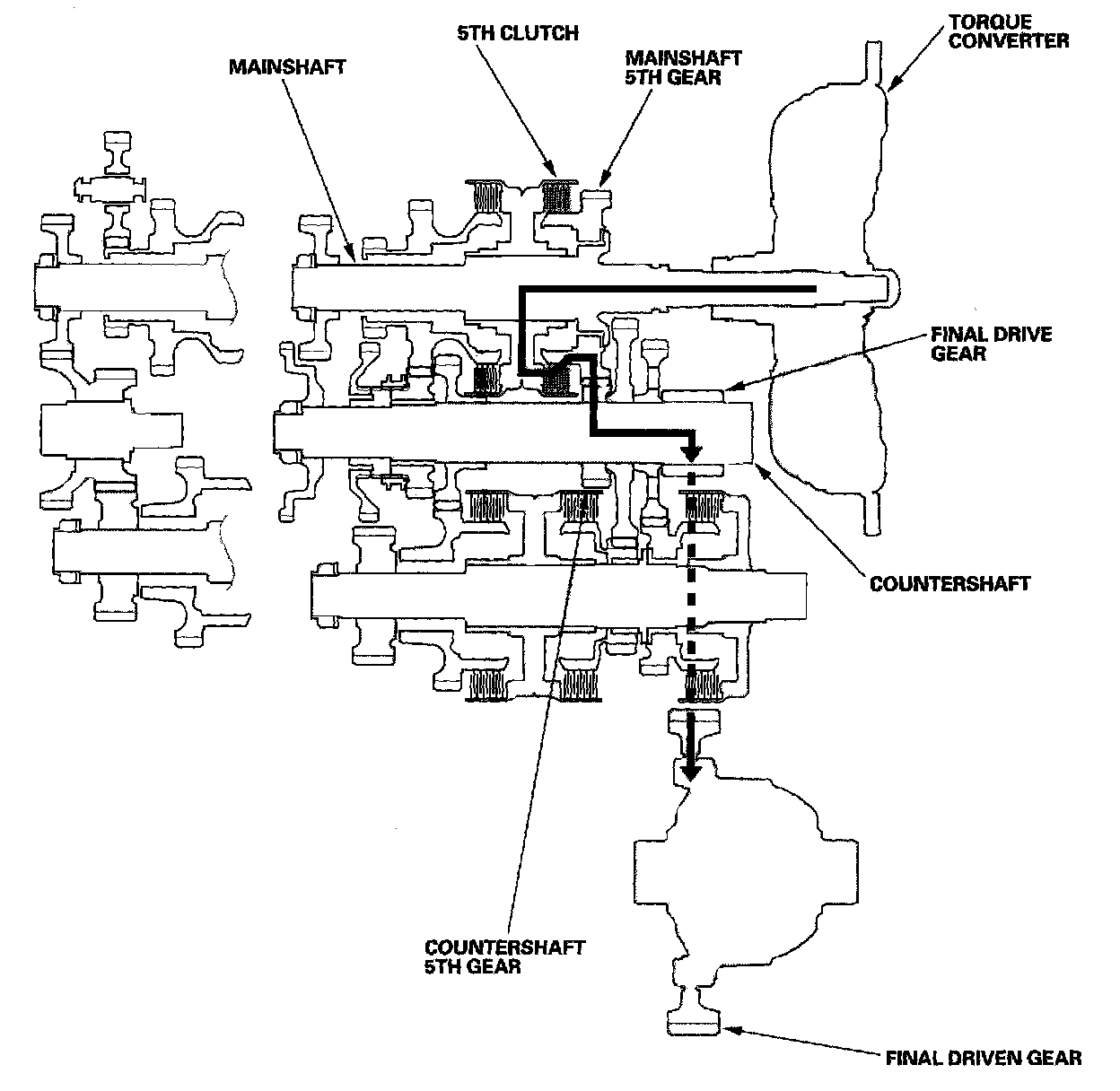 - Hydraulic pressure is applied to the 5th clutch, then the 5th clutch engages the mainshaft 5th gear with the mainshaft.