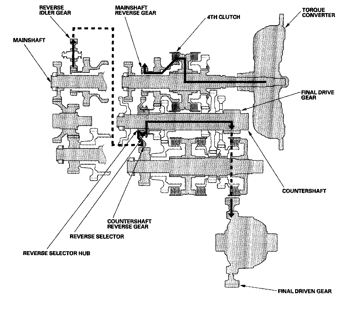 - Hydraulic pressure is also applied to the 4th clutch, then the 4th clutch engages the mainshaft reverse gear with the mainshaft.