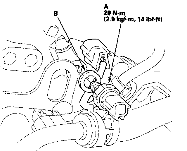 4. Install the new 2nd clutch transmission fluid pressure switch with a new sealing washer (B), and tighten the switch to the specified torque.