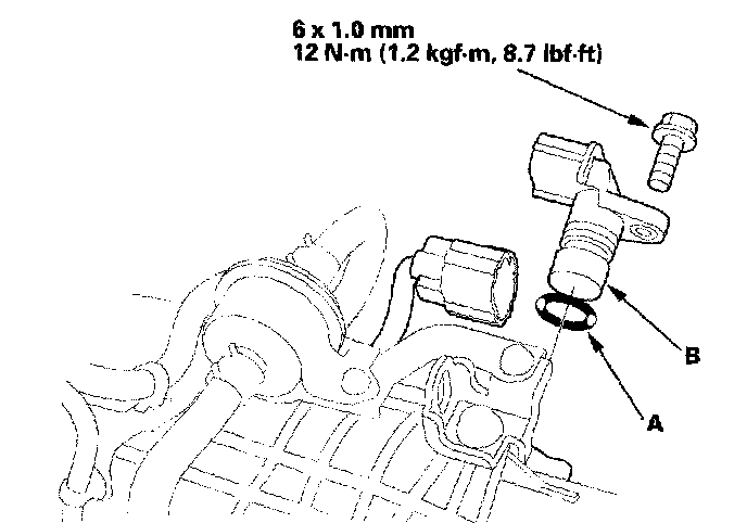 3. Install the new O-ring (A) on the new input shaft (mainshaft) speed sensor (B), then install the input shaft (mainshaft) speed sensor in the transmission housing.