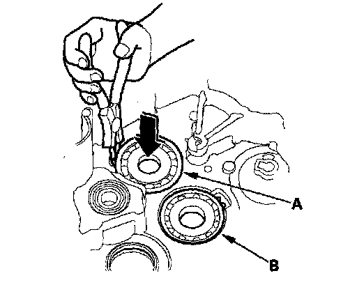2. To remove the mainshaft bearing (A) and countershaft bearing (B) from the transmission housing, expand each snap ring with the snap ring pliers, then push the bearing out.