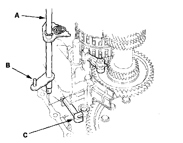 6. Align the spring pin (A) on the selector control shaft (B) with the transmission housing groove (C) by turning the selector control shaft with the control lever.