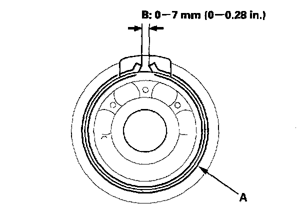 18. Verify that the secondary shaft bearing snap ring (A) is seated in the bearing and housing groove, and that the ring end gap (B) is correct.