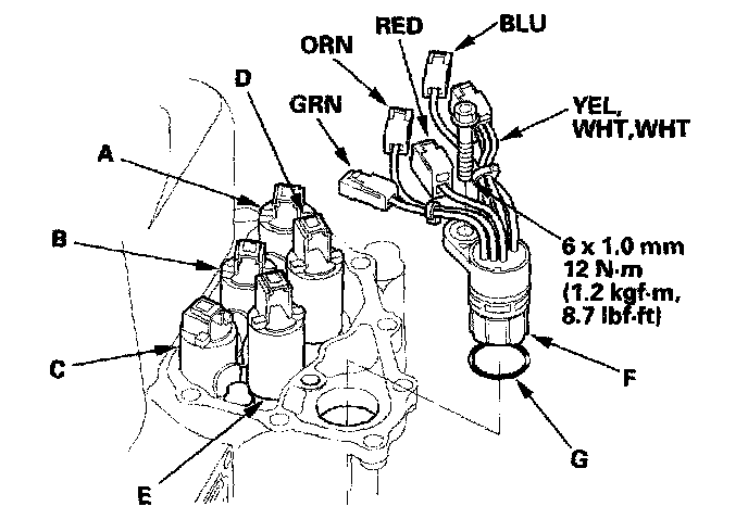 3. Disconnect the connectors from the shift solenoid valves, and remove the solenoid harness connector (F).