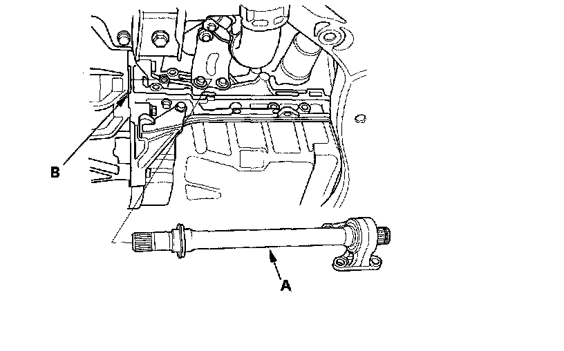 4. Remove the intermediate shaft (A) from the differential. Hold the intermediate shaft horizontal until it is clear of the differential to prevent damage to the differential oil seal (B).