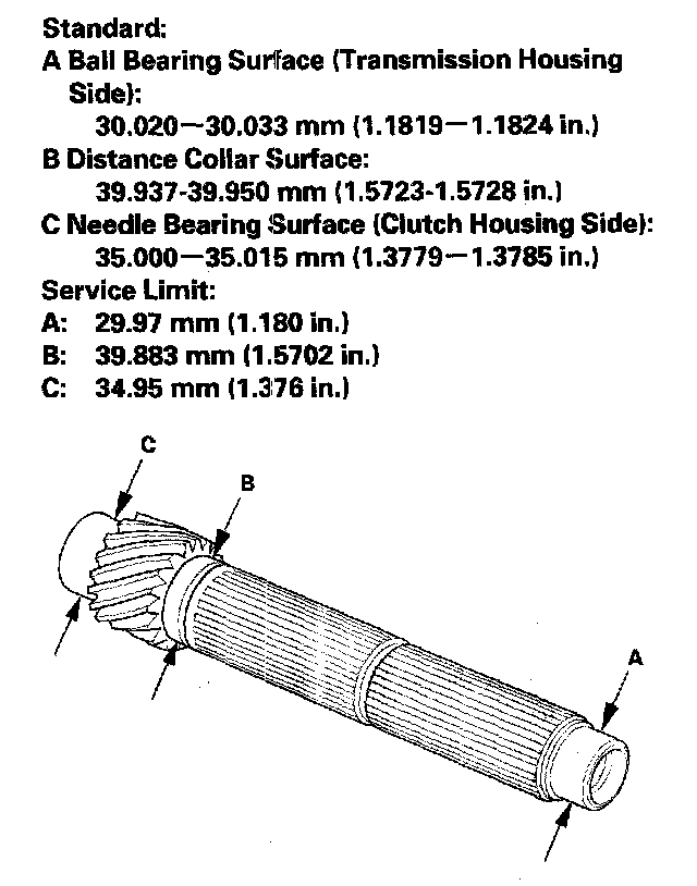 Countershaft Inspection1. Inspect the gear and bearing surfaces for wear and damage, then measure the countershaft at points A, B. and C. If any part of the countershaft is less than the service limit, replace it.