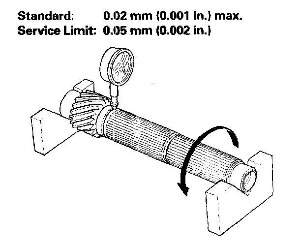 2. Inspect the runout by supporting both ends of the countershaft. Then rotate the countershaft two complete turns while measuring with a dial gauge. If the runout exceeds the service limit, replace the countershaft.