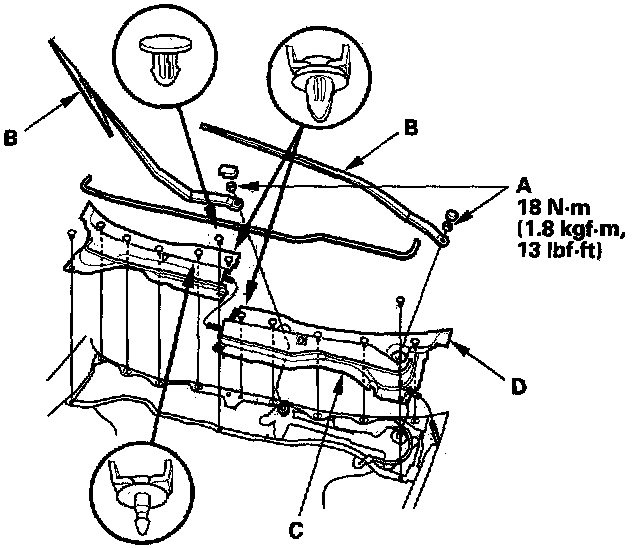 1. Open the hood. Remove the caps, nuts (A), and the windshield wiper arms (B).