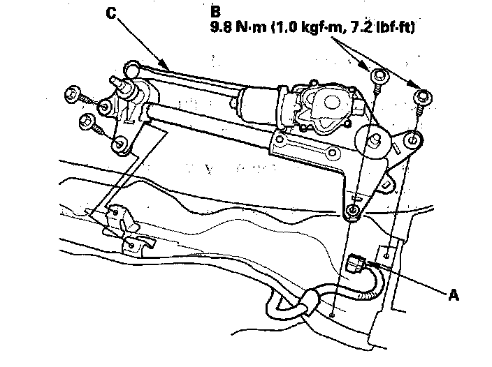 4. Remove the four bolts (B) and wiper linkage assembly (C).