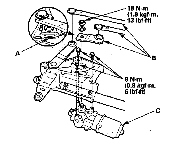 5. Scribe a line (A) across the link and windshield wiper linkage to show the original adjustment. Separate the windshield wiper linkage (B) from the wiper motor (C).
