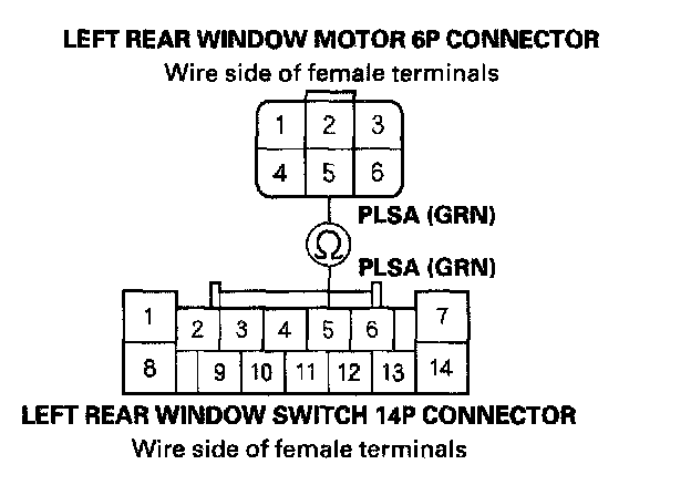 10. Check for continuity between left rear window switch 14P connector terminal No. 5 and left rear window motor 6P connector terminal No. 5.