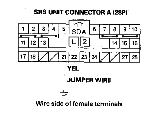 19. Connect SRS unit connector A (28P) terminal No. 21 and body ground with a jumper wire.