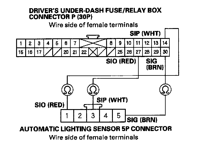 7. Check for continuity between the driver's under-dash fuse/relay box connector P (30P) terminals No. 14, No. 27 and No. 30 and automatic lighting sensor 5P connector terminals No. 1, No. 3, and No. 5 respectively.