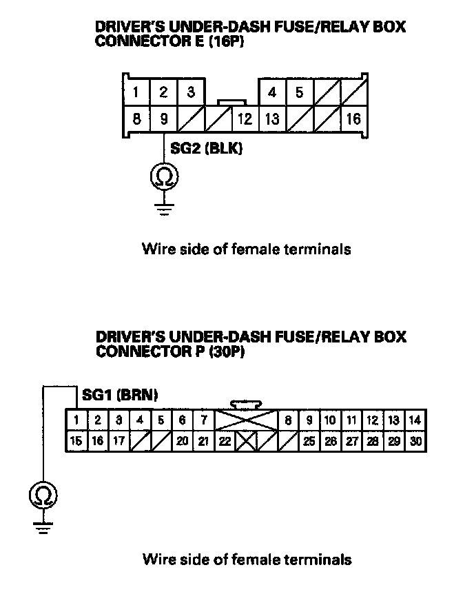 10. Check for continuity between body ground and driver's under-dash fuse/relay box connector P (30P) terminal No. 1 and driver's under-dash fuse/relay box connector E (16P) terminal No. 9 individually.