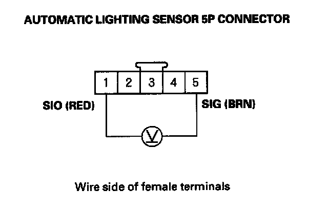 13. Check for voltage between the automatic lighting sensor 5P connector terminals No. 1 and No. 5.