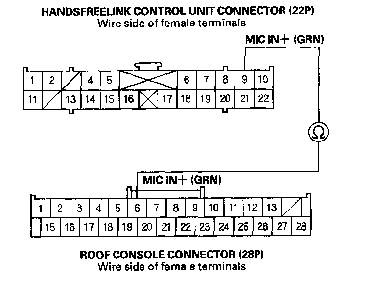 10. Check for continuity between HandsFreeLink control unit 22P connector terminal No. 9 and roof console 28P connector terminal No. 6.
