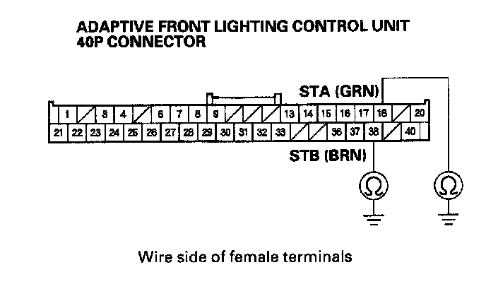 18. Check for continuity between body ground and adaptive front lighting control unit 40P connector terminals No. 18 and No. 38 respectively.