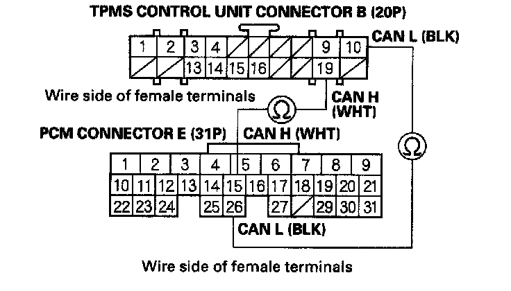 12. Check for continuity between the TPMS control unit connector B (20P) and the PCM connector E (31P).