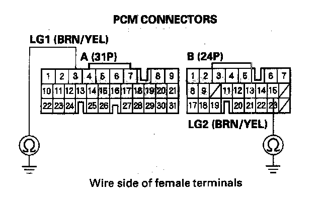 8. Check for continuity between PCM connector terminals A3 and body ground, and between B15 and body ground.