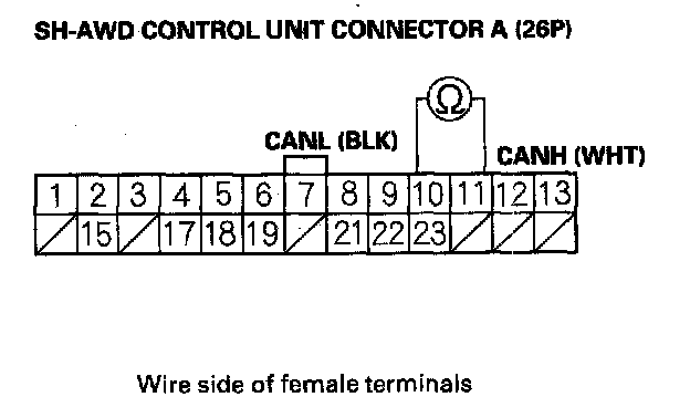 15. Check for continuity between body ground and SH-AWD control unit connector terminals B2 and B3 individually, and between SH-AWD control unit connector terminal A12 and body ground.