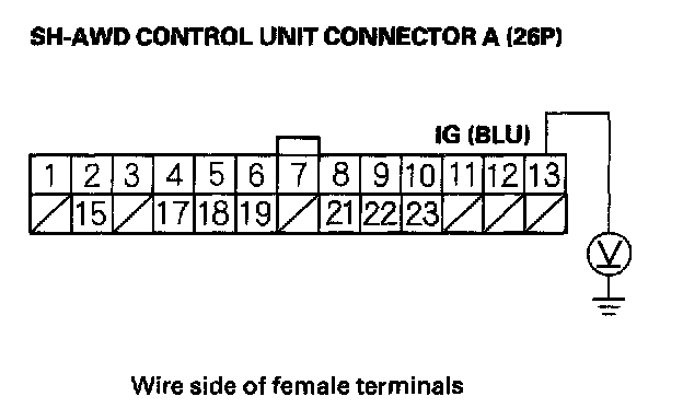 12. Measure voltage between SH-AWD control unit connector terminal A13 and body ground.