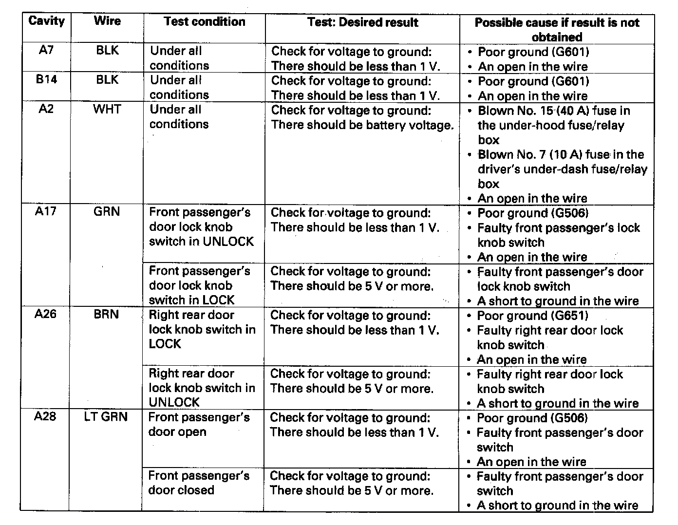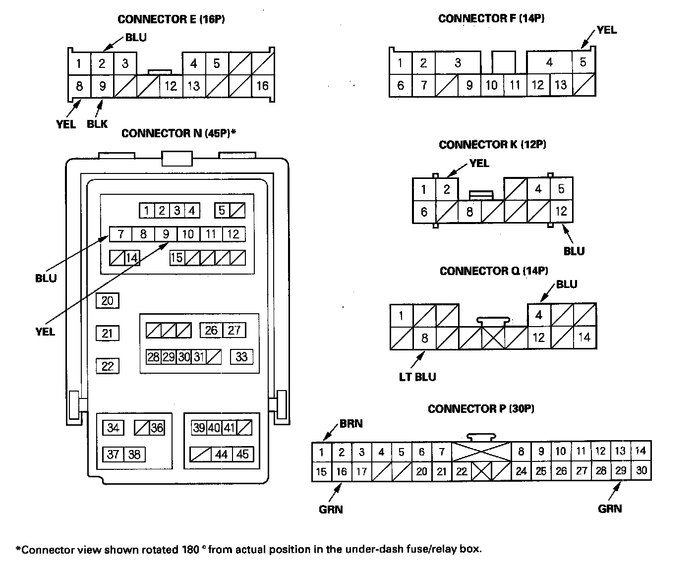 6. Reconnect the connectors to the driver's under-dash fuse/relay box turn the ignition switch ON (II), and make these input tests at the connectors.