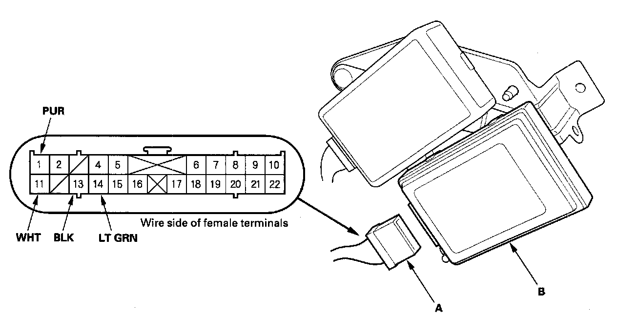 2. Disconnect the 22P connector (A) from the HandsFreeLink control unit (B).