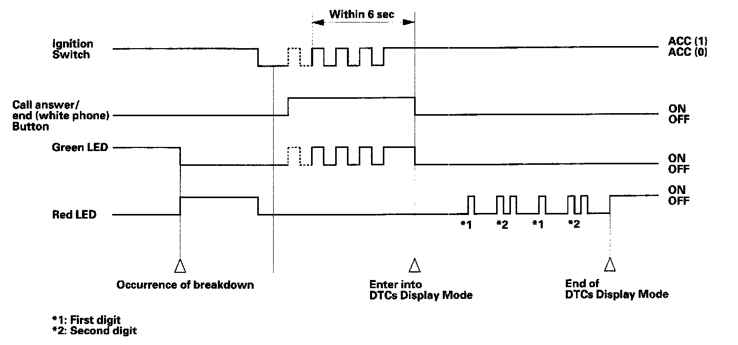 2. Press and hold the call answer/call end (white phone) button, and turn the ignition switch from off (0) to ACC (I) three times within 6 seconds ending with the ignition switch in ACC (I).