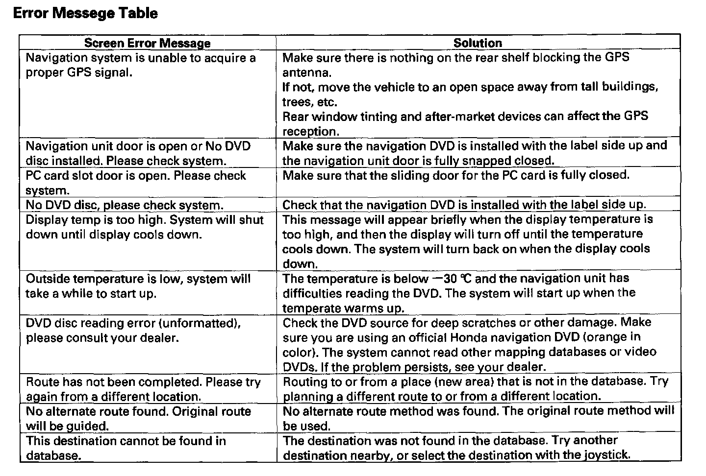 Error Message Table