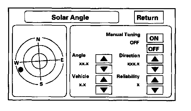 This screen is used to graphically display the sun's position as determined by GPS. The navigation system uses the sun's angle, along with the sunlight sensor to control the driver/passenger A/C air flow. The heat that must be removed by the A/C unit varies, depending on the angle of the sun entering the vehicle. This screen is for factory use only, and should not be adjusted.
