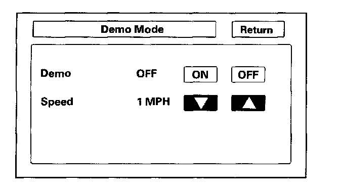 This screen is for factory use only, and should always be set to "OFF." Occasionally "DEMO" setting is turned "ON" when vehicles are being used at Auto Shows or similar events. Turning this feature on, allows the navigation system to automatically follow a route to destination when the vehicle is stationary. The "Speed" can change the speed of the demo mode.