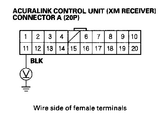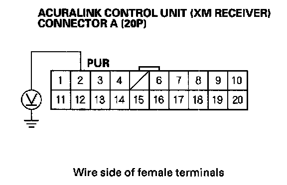 3. Measure the voltage between the No. 2 terminal of the AcuraLink control unit connector A (20P) and body ground.