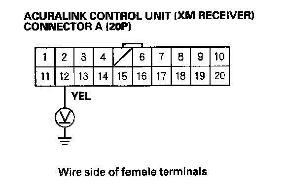 5. Measure the voltage between the No. 12terminal of the AcuraLink control unit connector A (20P) and body ground.