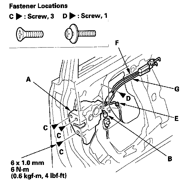 4. Pass the lock cable (F) and the inner handle cable (G) through the space between the door and the wire harness, then remove the latch through the hole in the door. Take care not to kink the cables.